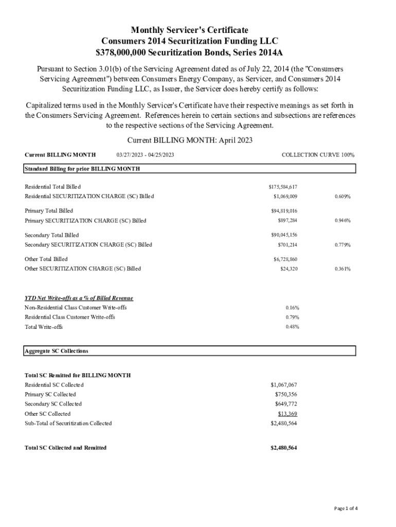 Monthly Service\'s Certificate Consumers 2014 Securitization Funding LLC $378,000,000 Securitization Bonds, Series 2014A Pursuant to Section 3.01(b) of the Servicing Agreement dated as of July 22,