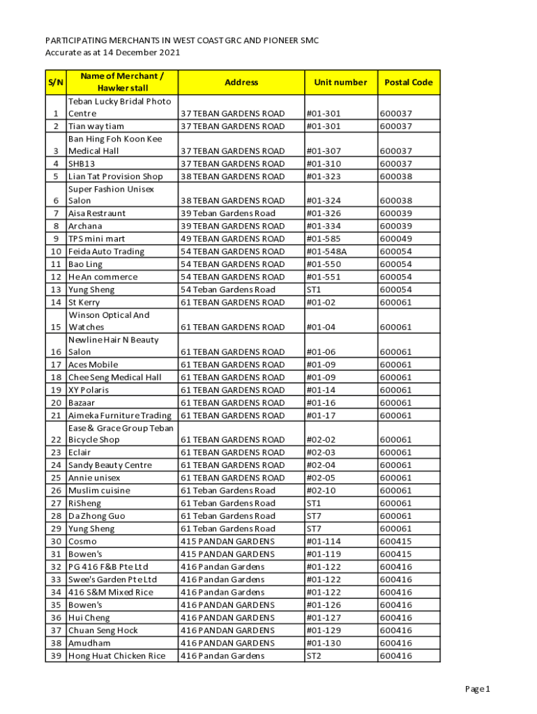PARTICIPATING MERCHANTS IN WEST COAST GRC AND PIONEER SMC Accurate as at 14 December 2021 S/N 1 2 3 4 5 6 7 8 9 10 11 12 13 14 15 16 17 18 19 20 21 22 23 24 25 26 27 28 29 30 31 32 33 34 35 36 37