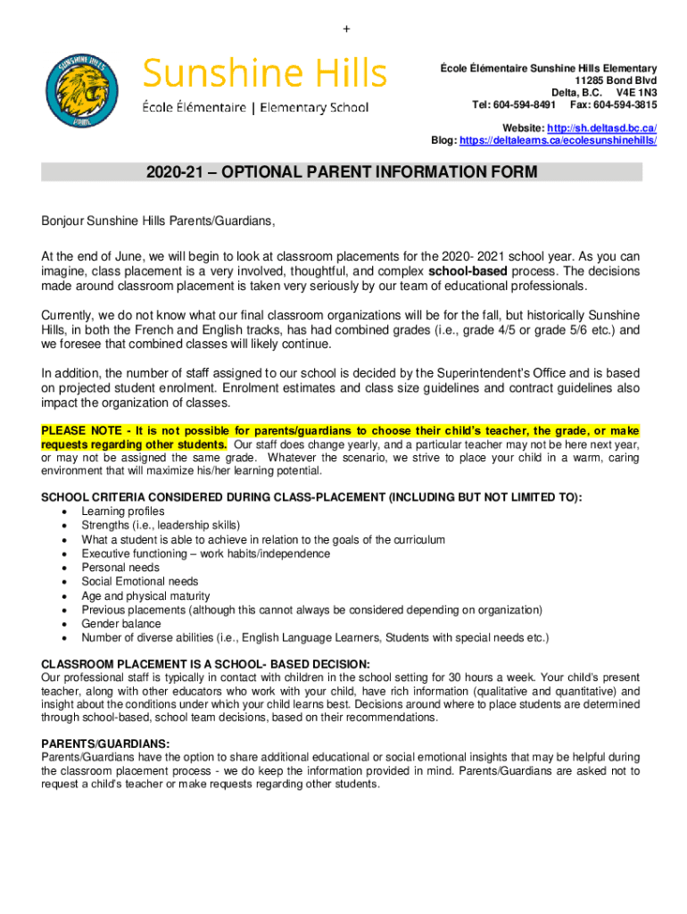 Information such as student demographics, emergency contact information, and medical needs must be reported on Sunshine Hills Elementary forms.
