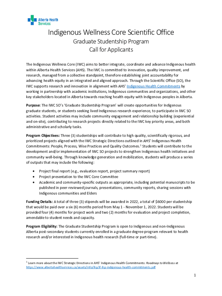 Indigenous Wellness Core Scientific Office Graduate Studentship Program Call for Applicants Indigenous Wellness Core (IWC) aims to better integrate, coordinate and advance Indigenous health within