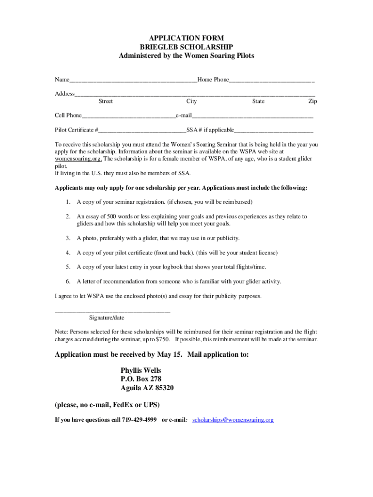 APPLICATION FORM BRIDGE SCHOLARSHIP Administered by the Women Soaring Pilots Name___Home Phone___ Address___ Street City State Zip Cell Phone___email___ Pilot Certificate #___SSA # if applicable___
