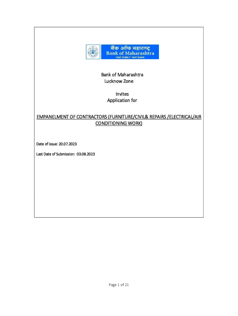 Bank of Maharashtra Lucknow Zone Invites Application for EMBANKMENT OF CONTRACTORS (FURNITURE/CIVIL REPAIRS /ELECTRICAL/AIR CONDITIONING WORK)Date of issue: 20.07.2023 Last Date of Submission: 03.08.2023Page