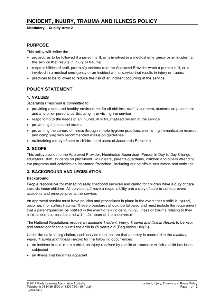 INCIDENT, INJURY, TRAUMA AND ILLNESS POLICY Mandatory Quality Area 2PURPOSE This policy will define the: procedures to be followed if a person is ill, or is involved in a medical emergency or an incident