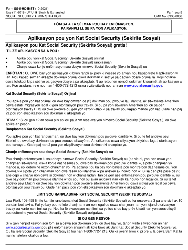 Form SS5HCINST (102021) Use (112019) OF Until Stock Is Exhausted SOCIAL SECURITY Administration 1 sou 5 OMB No. 09600066FM SA À la SLOAN POU BAY ENFMASYON. PA RANDI LI. SE PA YON APLIKASYON. Aplikasyon