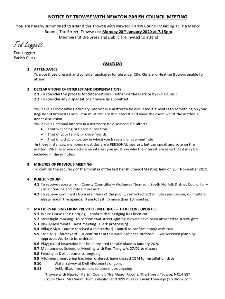 NOTICE OF BROWSE WITH NEWTON PARISH COUNCIL MEETING You are hereby summoned to attend the Browse with Newton Parish Council Meeting at The Manor Rooms, The Street, Browse on: Monday 20th January 2020