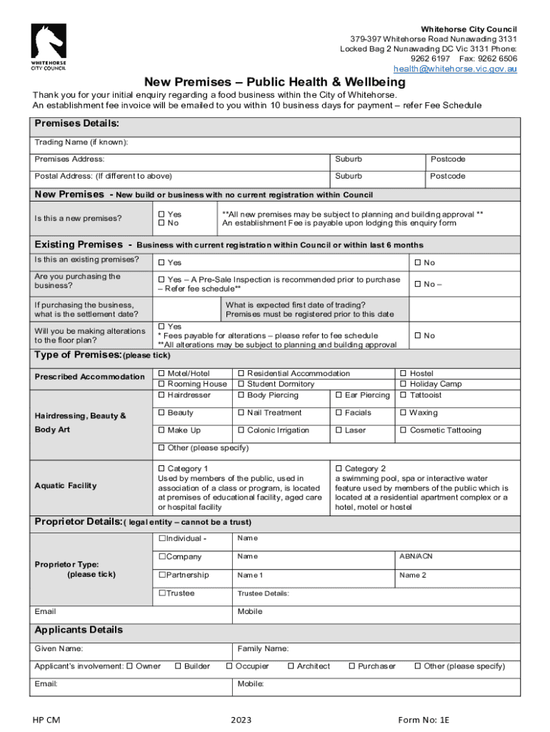 Whitehorse City Council 379397 Whitehorse Road Unloading 3131 Locked Bag 2 Unloading DC Vic 3131 Phone: 9262 6197 Fax: 9262 6506health@whitehorse.vic.gov.auNew Premises Public Health & WellbeingThank