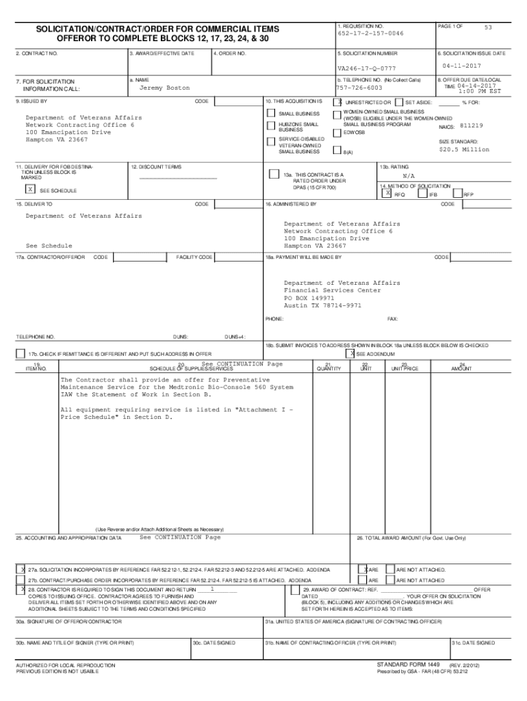 1. REQUISITION NO.SOLICITATION/CONTRACT/ORDER FOR COMMERCIAL ITEMS OFFER OR TO COMPLETE BLOCKS 12, 17, 23, 24, & 30 2. CONTRACT NO.3. AWARD/EFFECTIVE AVERAGE 1 OF4. ORDER NO.5. SOLICITATION NUMBER6.