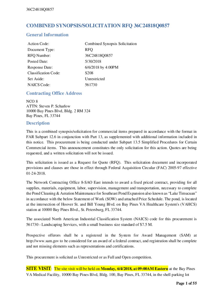 36C24818Q0857COMBINED SYNOPSIS/SOLICITATION RFQ 36C24818Q0857 General Information Action Code: Document Type: RFQ Number: Posted Date: Response Date: Classification Code: Set Aside: NAILS Code:Combined