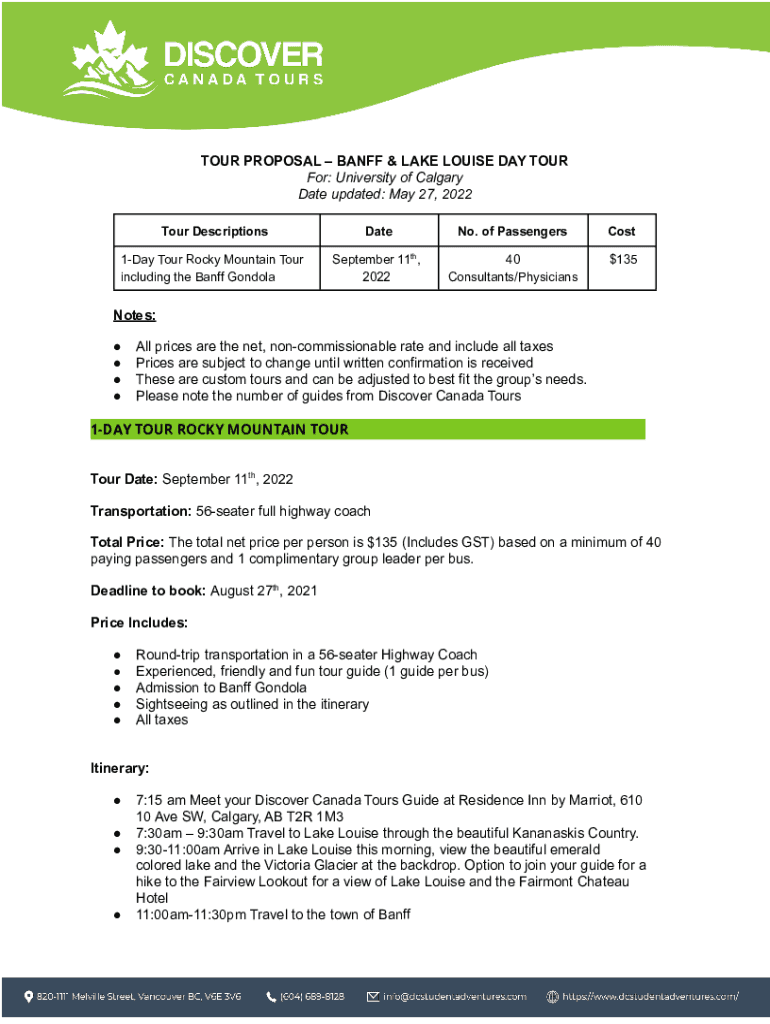 TOUR PROPOSAL BA NFF & LAKE LOUISE DAY TOUR For: University of Calgary Date updated: May 27, 2022, Tour DescriptionsDateNo. Of PassengersCost1Day Tour Rocky Mountain Tour including the Ban ff Gondola