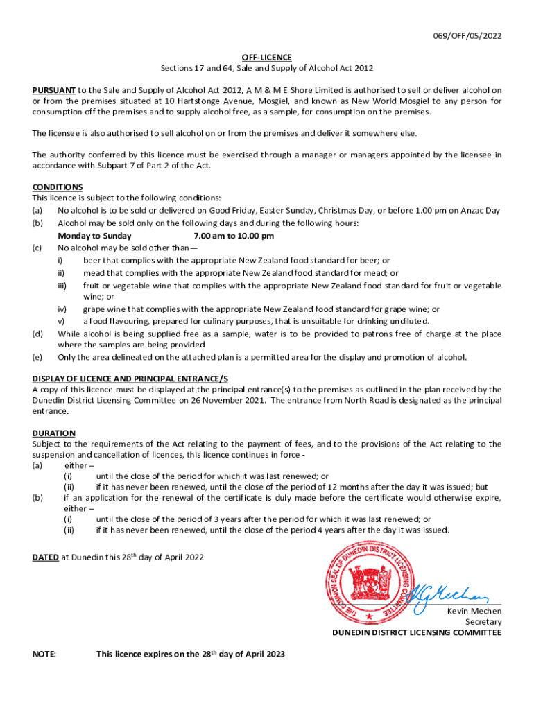 069/OFF/05/2022 OFFLINE Sections 17 and 64, Sale and Supply of Alcohol Act 2012 PURSUANT to the Sale and Supply of Alcohol Act 2012, A M & M E Shore Limited is authorized to sell or deliver alcohol