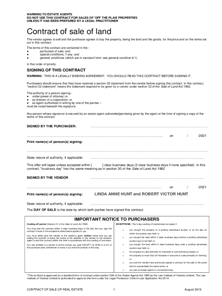 WARNING TO ESTATE AGENTS DO NOT USE THIS CONTRACT FOR SALES OF \'OFF THE PLAN\' PROPERTIES UNLESS IT HAS BEEN PREPARED BY A LEGAL PRACTITIONERContract of sale of land The vendor agrees to sell and