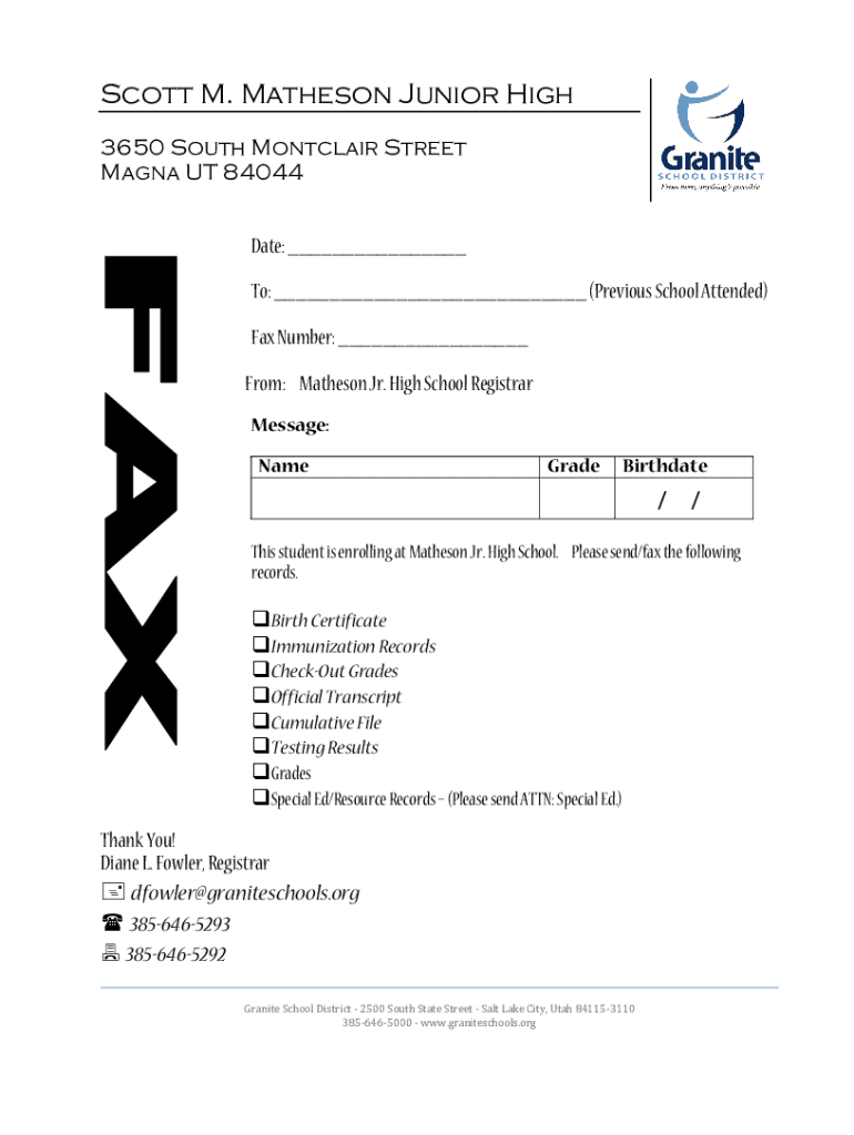 Scott M. Matheson Junior High 3650 South Montclair Street Magma UT 84044 Date: ___ To: ___ (Previous School Attended) Fax Number: ___ From: Matheson Jr. High School Registrar Message: NameGradeBirthdate