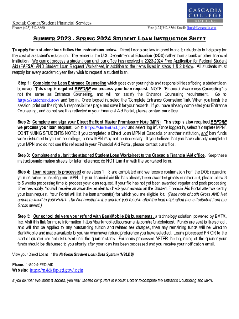 Kodiak Corner/Student Financial Services Phone: (425) 3528860Fax: (425)3528564 Email: finaid@cascadia.eduSUMMER 2023 SPRING 2024 STUDENT LOAN INSTRUCTION SHEET To apply for a student loan follow the