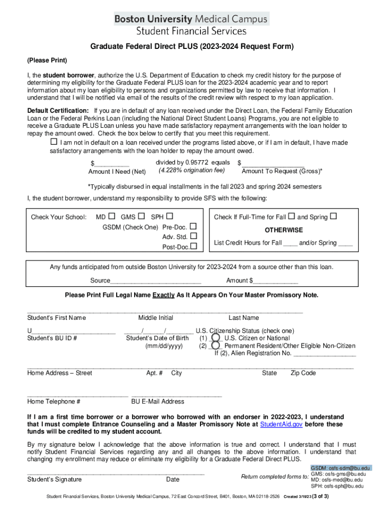 Students at Boston University Medical Campus (BUMC) who require additional financial aid beyond federal loans may need to fill out the BUMC Graduate Plus form.