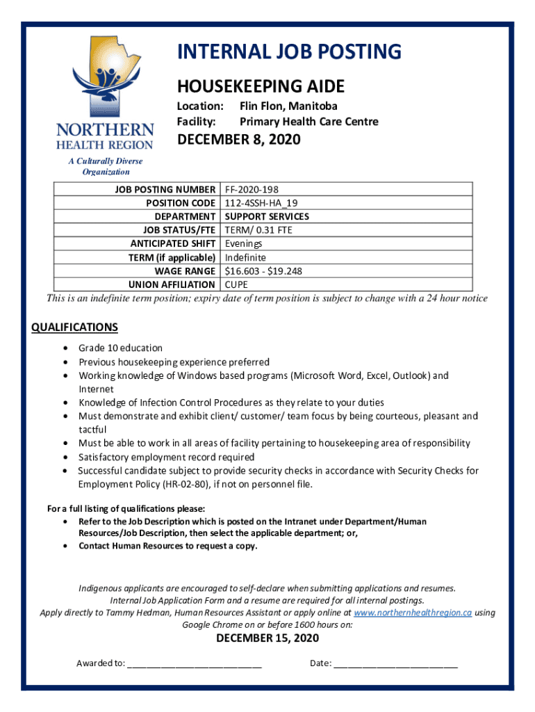 INTERNAL JOB POSTING HOUSEKEEPING AIDE Location: Facility:Flip Flow, Manitoba Primary Health Care CentreDECEMBER 8, 2020 A Culturally Diverse Organization POSTING NUMBER FF2020198 POSITION CODE 1124SSHHA_19