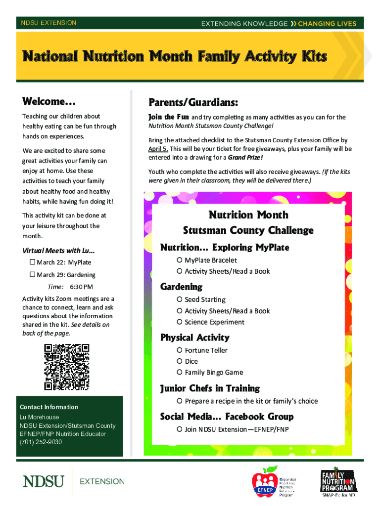 DSU EXTENSIONNational Nutrition Month Family Activity Kits Welcome... Parents/Guardians:Teaching our children about healthy eating can be fun through hands-on experiences. Join the Fun and try completing
