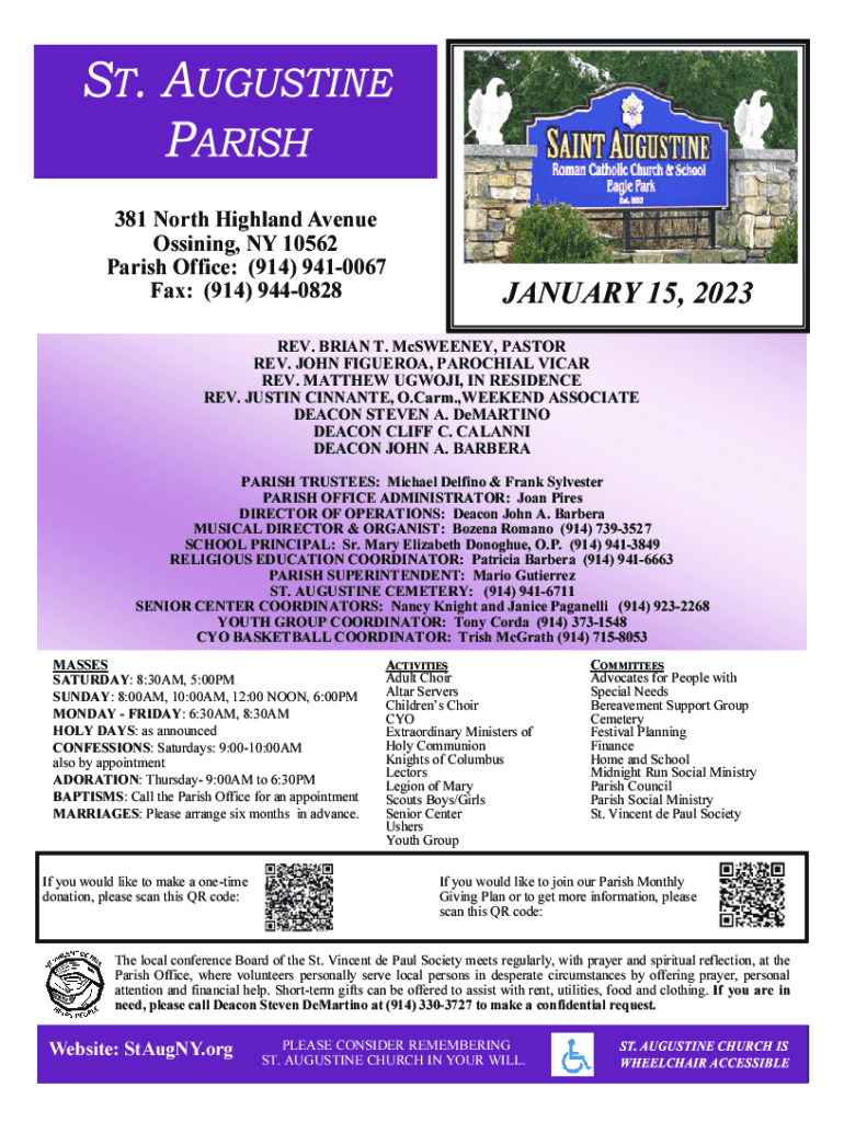 381 North Highland Avenue Assigning, NY 10562 Parish Office: (914) 9410067 Fax: (914) 9440828JANUARY 15, 2023REV. BRIAN T. Sweeney, PASTOR REV. JOHN FIGUEROA, PAROCHIAL VICAR REV. MATTHEW GOBI, IN