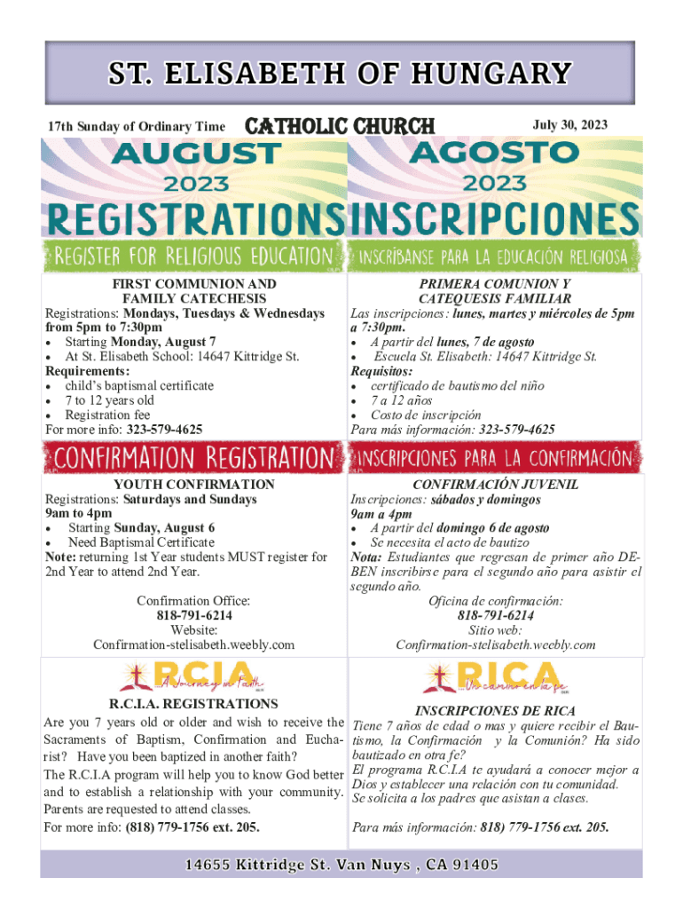 17th Sunday of Ordinary TimeCATHOLIC CHURCH July 30, 2023FIRST COMMUNION AND FAMILY CATECHISMS Registrations: Mondays, Tuesdays & Wednesdays from 5pm to 7:30pm Starting Monday, August 7 At St. Elisabeth