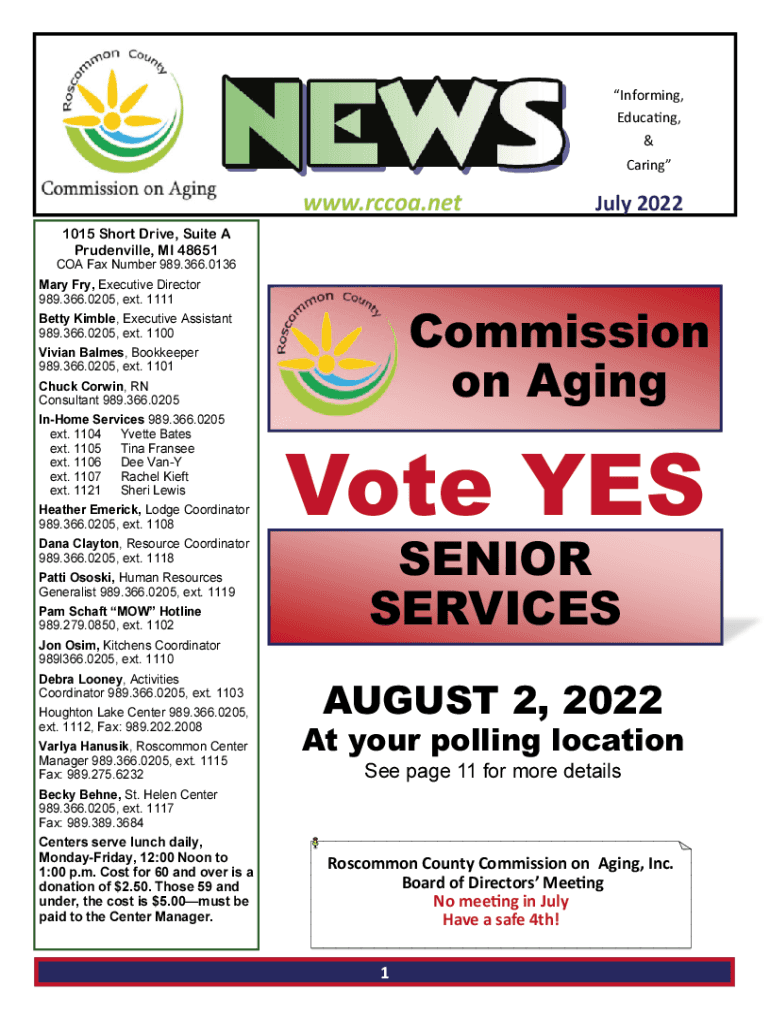 Informing, Educing, & Caring.Rico.net July 20221015 Short Drive, Suite A Vaudeville, MI 48651COA Fax Number 989.366.0136 Mary Fry, Executive Director 989.366.0205, ext. 1111Commission on Aging Betty