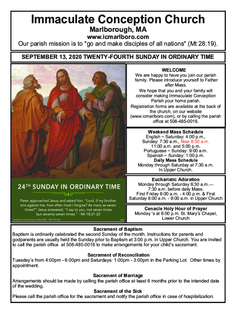 Immaculate Conception Church Marlborough, Macaw.icmarlboro.com Our parish mission is to \” go and make disciples of all nations\” (Mt 28:19). SEPTEMBER 13, 2020, TWENTYFOURTH SUNDAY IN ORDINARY
