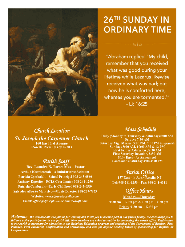 Church Location St. Joseph the Carpenter Church 160 East 3rd Avenue Roselle, New Jersey 07203Parish Staff Mass Schedule Daily (Monday to Thursday & Saturday) 8:00 AM Fridays 7:30 AM Saturday Vigil