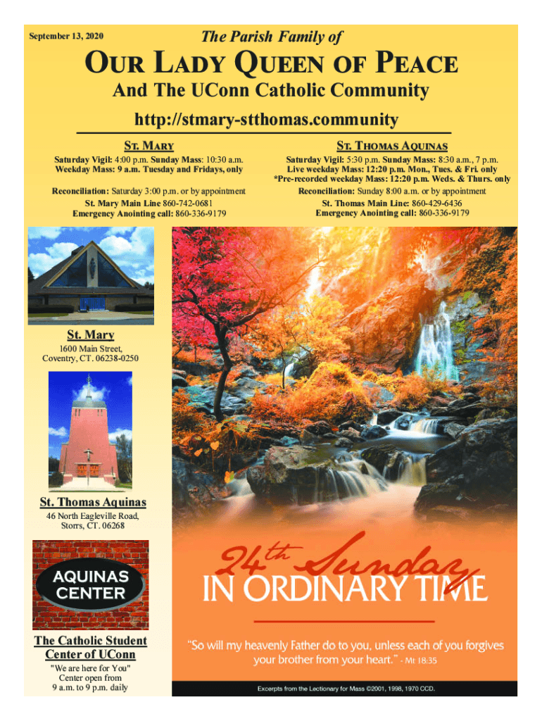 The Parish Family of September 13, 2020O L UP And The Conn Catholic Community http://stmarystthomas.community S. Saturday Vigil: 4:00 p.m. Sunday Mass: 10:30 a.m. Weekday Mass: 9 a.m. Tuesday and