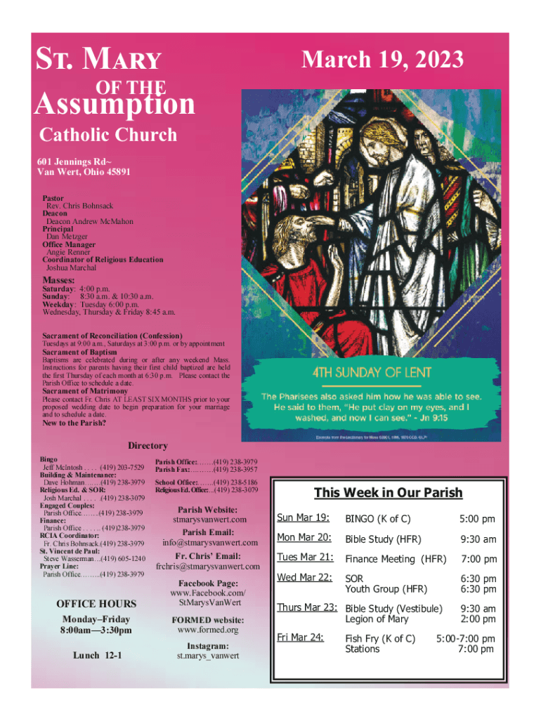S. M OF THE Assumption Catholic Church601 Jennings Rd Van Were, Ohio 45891Pastor Rev. Chris Cossack Deacon Andrew McMahon Principal Dan Metzger Office Manager Angie Runner Coordinator of Religious