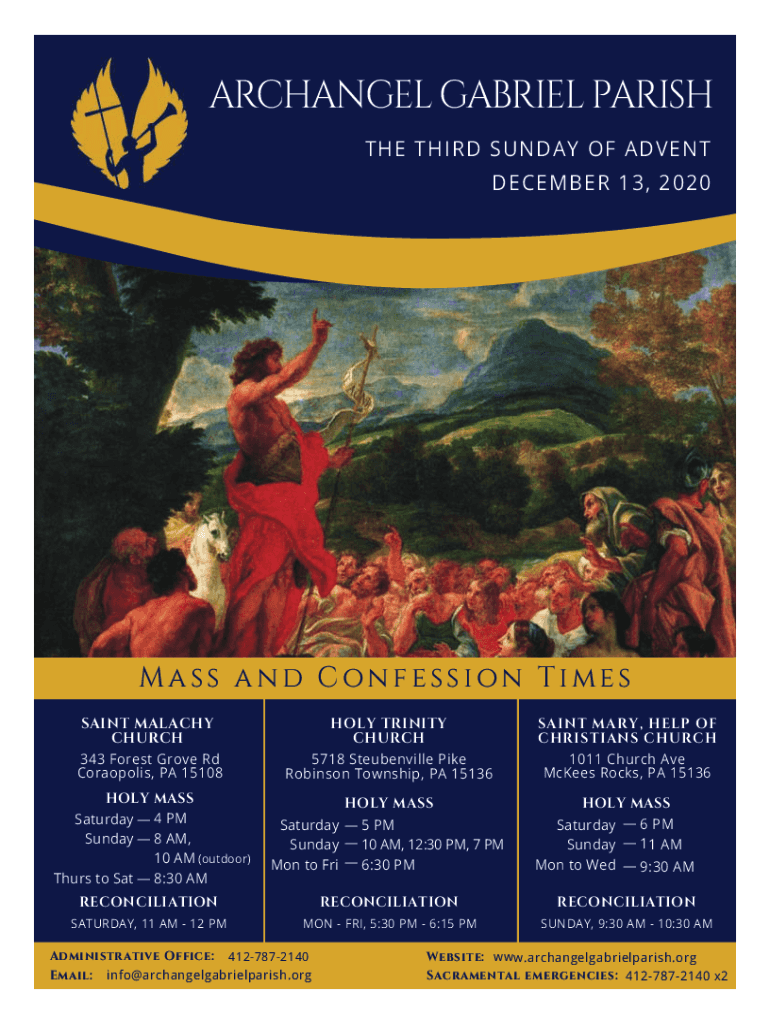 ARCHANGEL GABRIEL PARISH THE THIRD SUNDAY OF ADVENT DECEMBER 13, 2020Mass and Confession Times SAINT MALACHI CHURCH 343 Forest Grove Rd Acropolis, PA 15108HOLY TRINITY CHURCH 5718 Steubenville Pike