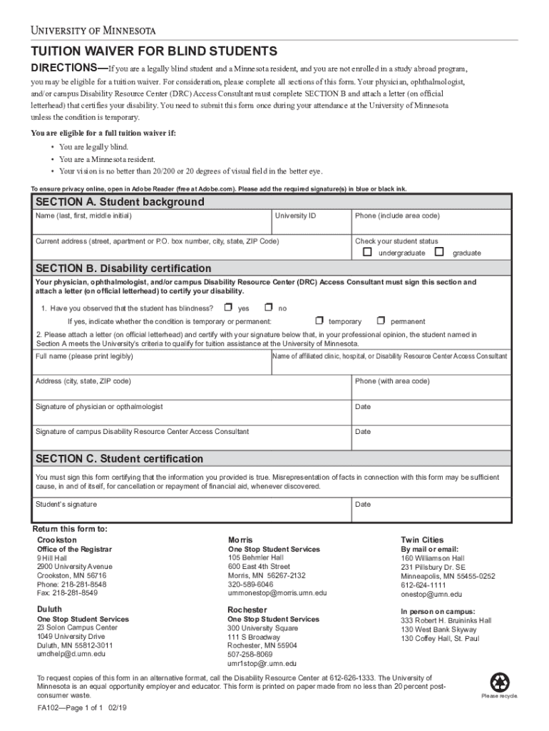 TUITION WAIVER FOR BLIND STUDENTS Directions you are a legally blind student and a Minnesota resident, and you are not enrolled in a study abroad program, you may be eligible for a tuition waiver.