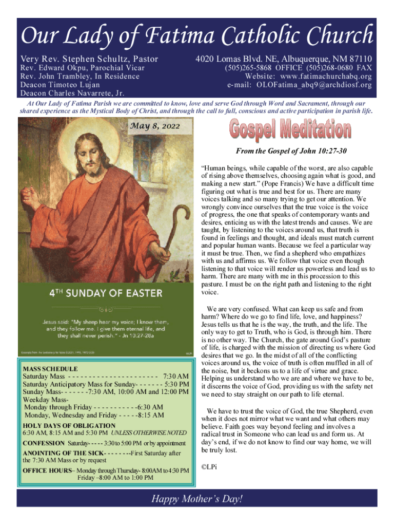 Our Lady of Fatima Catholic Church Very Rev. Stephen Schultz, Pastor4020 Lamas Blvd. NE, Albuquerque, NM 87110 Rev. Edward KPU, Parochial Vicar Rev. John Trembley, In Residence Deacon Timothy Lutein