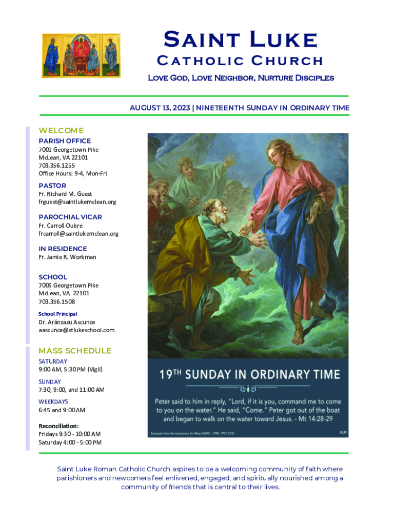 Saint Luke Catholic Church Love God, Love Neighbor, Nurture DisciplesAUGUST 13, 2023 | NINETEENTH SUNDAY IN ORDINARY TIMEWELCOME PARISH OFFICE 7001 Georgetown Pike McLean, VA 22101 703.356.1255 Office