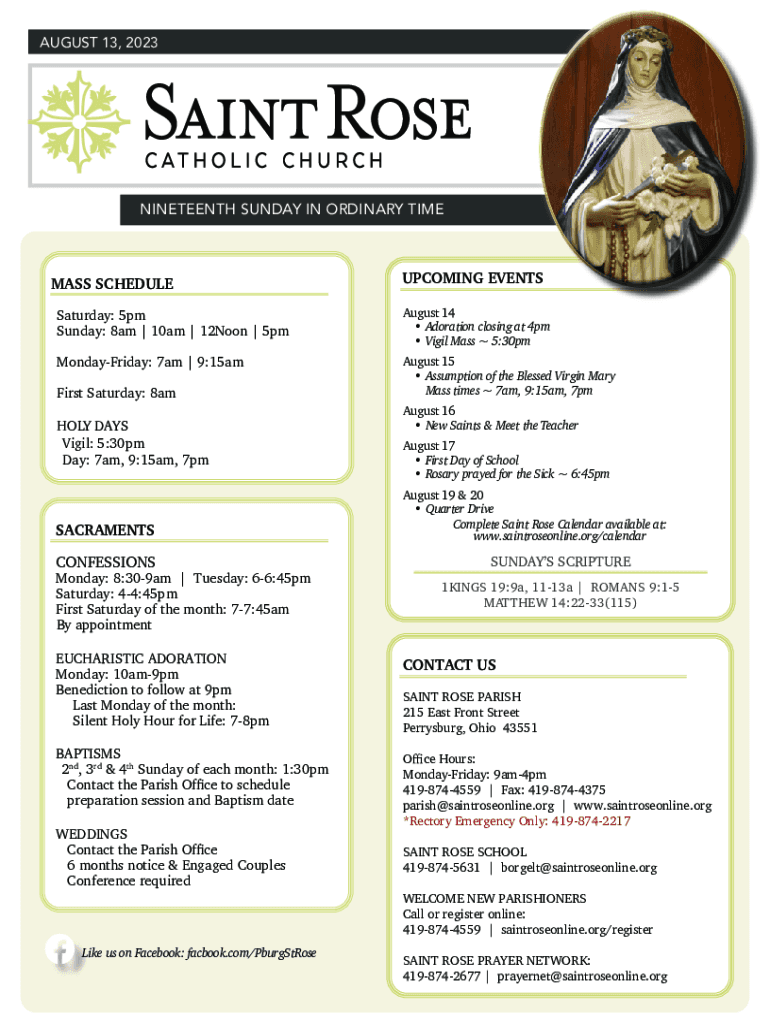 AUGUST 13, 2023NINETEENTH SUNDAY IN ORDINARY TIMELESS SCHEDULE Saturday: 5pm Sunday: 8am | 10am | 12Noon | 5pm Monday Friday: 7am | 9:15am First Saturday: 8am HOLY DAYS Vigil: 5:30pm Day: 7am, 9:15am,