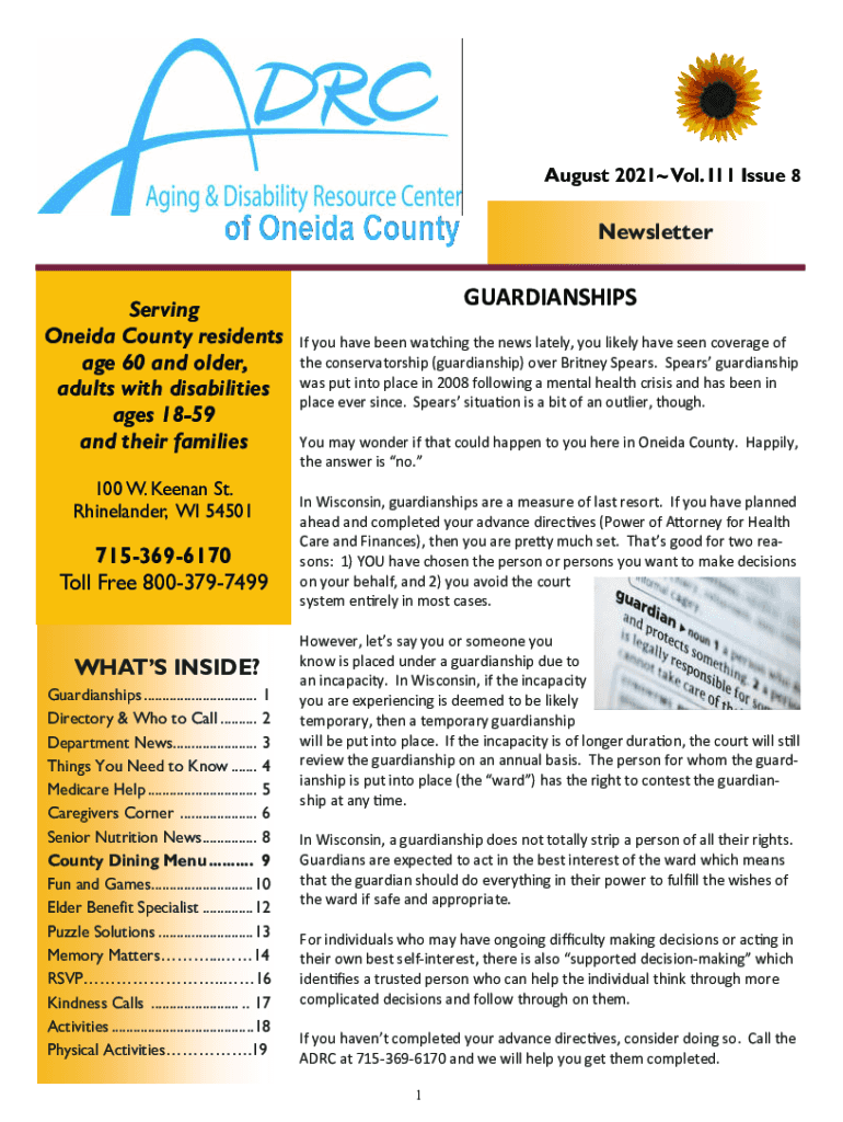 August 2021 Vol. I11 Issue 8Newsletter Serving Oneida County residents age 60 and older, adults with disabilities ages 1859 and their families 100 W. Keenan St. Rhinelander, WI 545017153696170 Toll