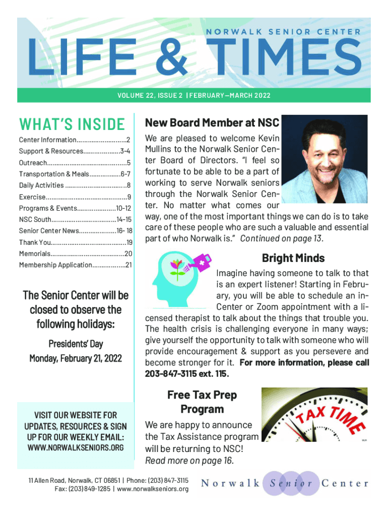VOLUME 22, ISSUE 2 | FEBRUARYMARCH 2022WHATS INSIDE Center Information2 Support & Resources.34 Outreach.......5 Transportation & Meals.67 Daily Activities .........8 Exercise.....9 Programs & Events...1012