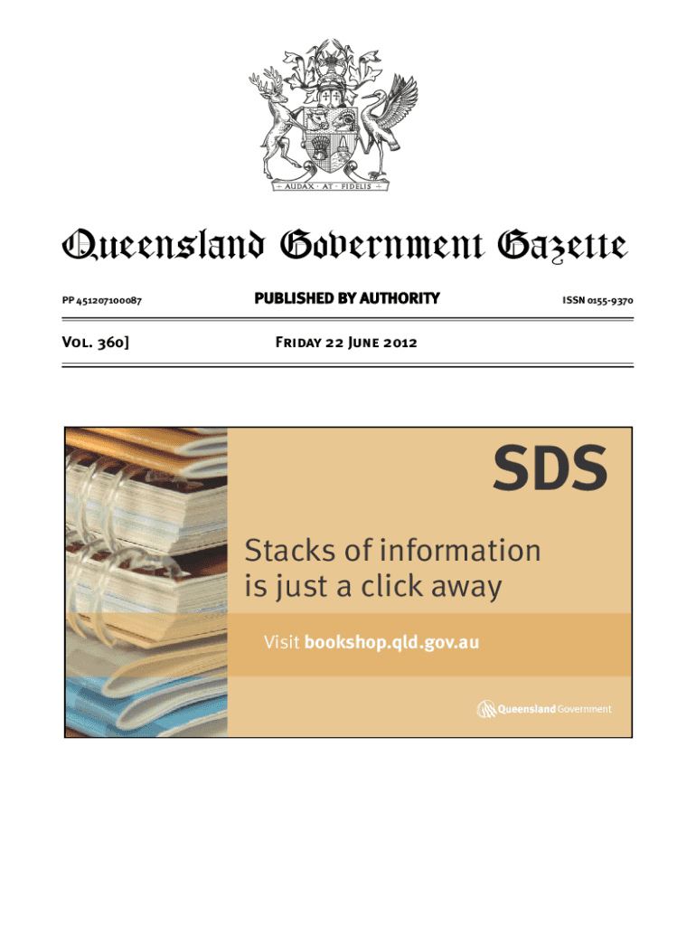 QueenslandGovernment Government Gazette Queensland Gazette PP 451207100087Vol. 360]PUBLISHED BY AUTHORITY ISSN 01559370Friday 22 June 2012SDS Stacks of information is just a click away Visit bookshop.QLD.gov.AU[335]Queensland