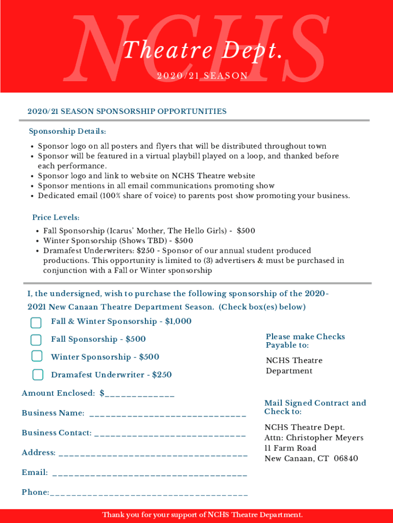 NHS Theater Dept. 2020/21 SEASON2020/21 SEASON SPONSORSHIP OPPORTUNITIES Sponsorship Details:Sponsor logo on all posters and flyers that will be distributed throughout town Sponsor will be featured