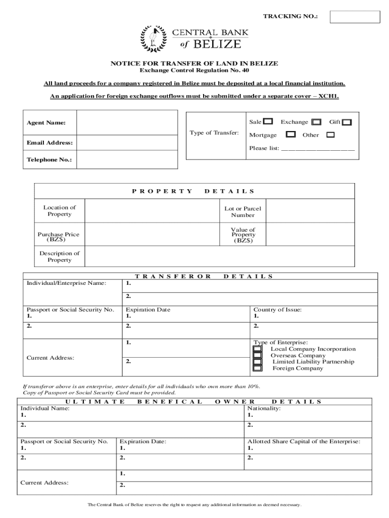 TRACKING NO.:NOTICE FOR TRANSFER OF LAND IN BELIZE Exchange Control Regulation No. 40 All land proceeds for a company registered in Belize must be deposited at a local financial institution. An application