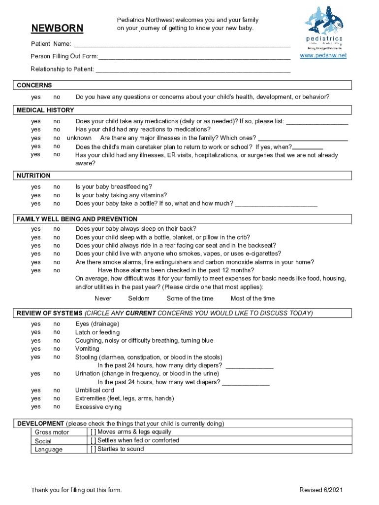 Pediatrics Northwest welcomes you and your family on your journey of getting to know your new baby.NEWBORNPatient Name: ___ Person Filling Out Form:___www.pedsnw.netRelationship to Patient: ___ CONCERNS