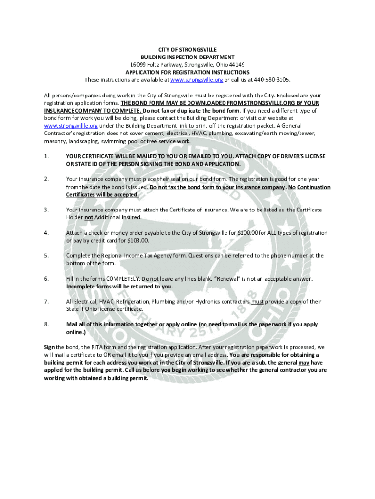CITY OF STRONGSVILLE BUILDING INSPECTION DEPARTMENT 16099 Felt Parkway, Strongsville, Ohio 44149 APPLICATION FOR REGISTRATION INSTRUCTIONS These instructions are available at www.strongsville.org