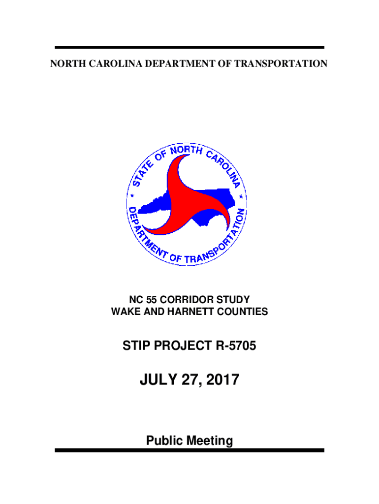 NORTH CAROLINA DEPARTMENT OF TRANSPORTATION NC 55 CORRIDOR STUDY WAKE AND BARNETT COUNTIESSTIP PROJECT R5705JULY 27, 2017Public MeetingPUBLIC MEETING NC 55 CORRIDOR STUDY Wake and Barnett Counties