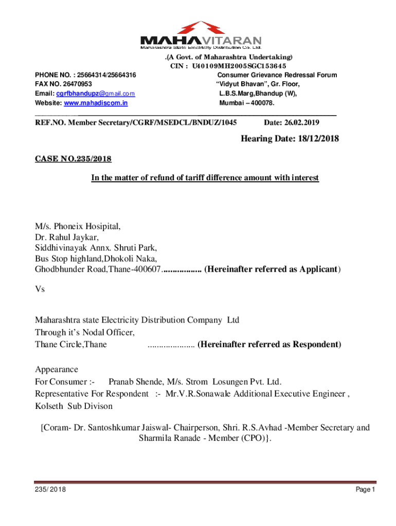 PHONE NO. 25664314/25664316 FAX NO. 26470953 Email: cgrfbhandupz@gmail.com Website: www.mahadiscom.in___.(A Govt. of Maharashtra Undertaking) IN : U40109MH2005SGC153645 Consumer Grievance Reparation