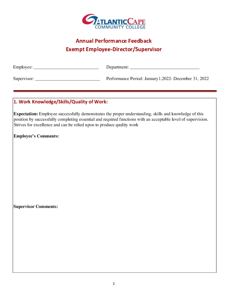 Annual Performance Feedback Exempt EmployeeDirector/Supervisor Employee: ___Department: ___Supervisor: ___Performance Period: January1,2022 December 31, 20221. Work Knowledge/Skills/Quality of Work: