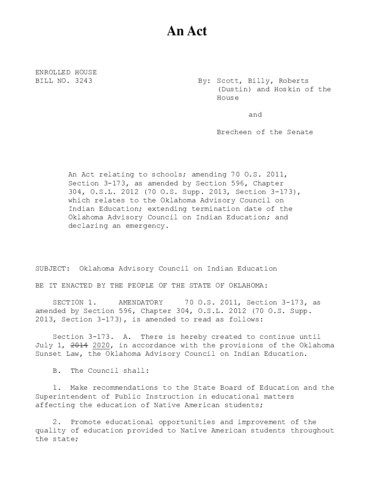 An Act ENROLLED HOUSE BILL NO. 3243By: Scott, Billy, Roberts (Dustin) and Ho skin of the House and Brethren of the Senate Act relating to schools; amending 70 O.S. 2011, Section 3173, as amended by