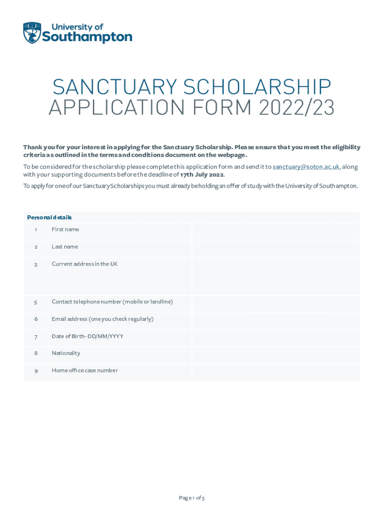 SANCTUARY SCHOLARSHIP APPLICATION FORM 2022/23 Thank you for your interest in applying for the Sanctuary Scholarship. Please ensure that you meet the eligibility criteria as outlined in the terms
