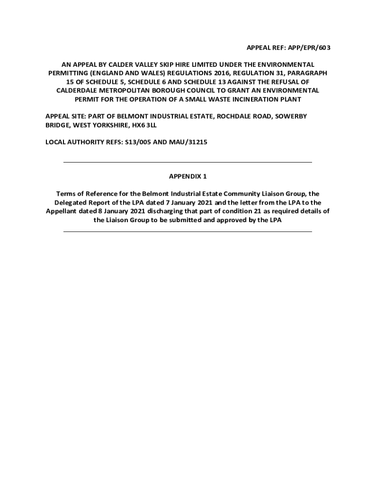 APPEAL REF: APP/EPR/603 AN APPEAL BY CALDER VALLEY SKIP HIRE LIMITED UNDER THE ENVIRONMENTAL PERMITTING (ENGLAND AND WALES) REGULATIONS 2016, REGULATION 31, PARAGRAPH 15 OF SCHEDULE 5, SCHEDULE 6