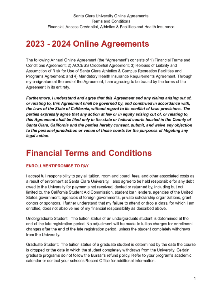 Santa Clara University Online Agreements Terms and Conditions Financial, Access Credential, Athletics & Facilities and Health Insurance2023 2024 Online Agreements The following Annual Online Agreement