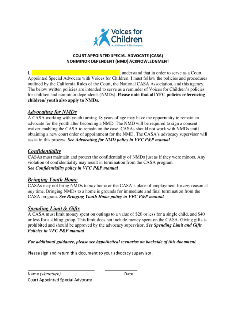 COURTAPPOINTEDSPECIALADVOCATE(CASA) NONINDEPENDENT(NAD)ACKNOWLEDGMENT I, understand that in order to serve as a Court Appointed Special Advocate with Voices for Children, I must follow the policies