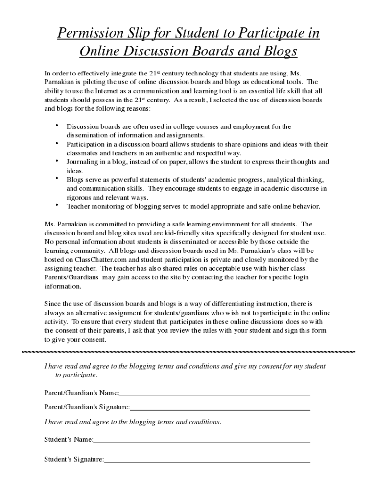 Permission Slip for Student to Participate in Online Discussion Boards and Blogs In order to effectively integrate the 21st century technology that students are using, Ms. Canadian is piloting the