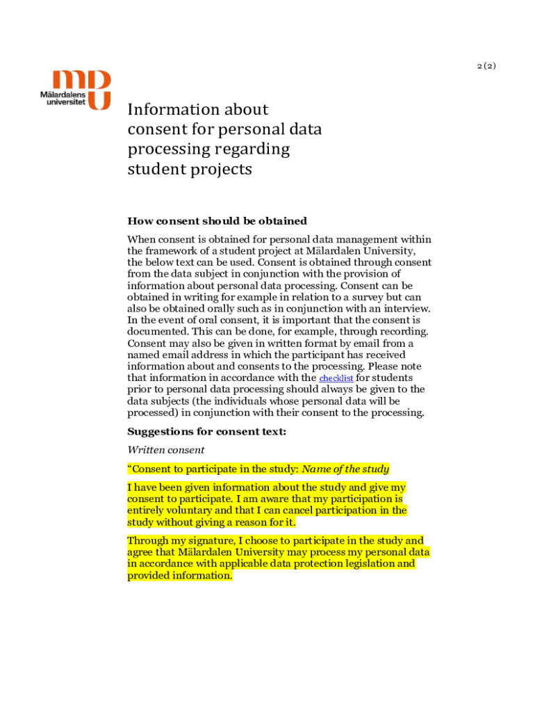 2 (2)Information about consent for personal data processing regarding student projects How consent should be obtained When consent is obtained for personal data management within the framework of