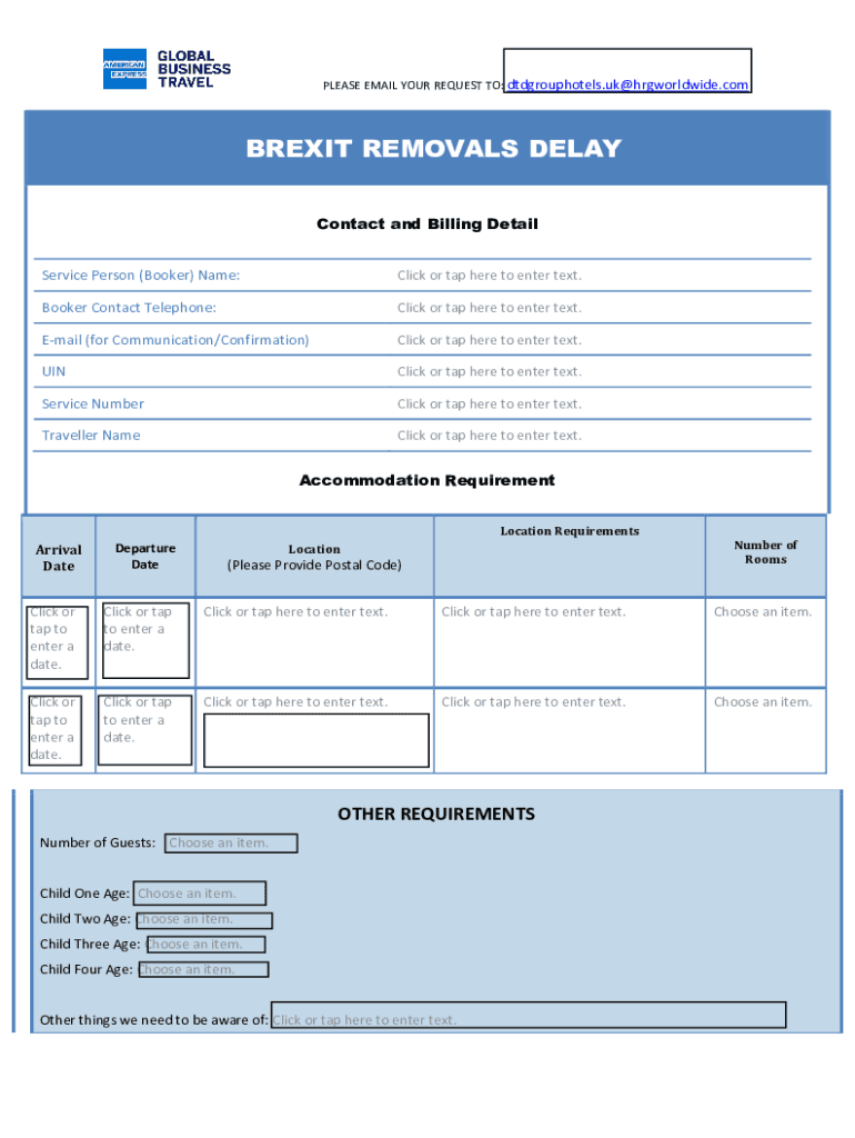 PLEASE EMAIL YOUR REQUEST TO: dtdgrouphotels.uk@hrgworldwide.comBREXIT REMOVALS DELAY